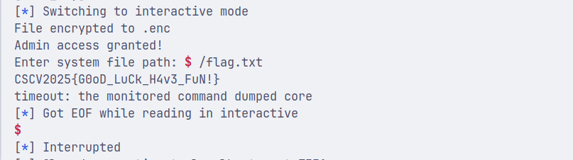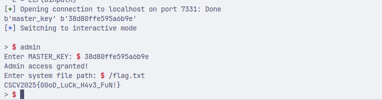 Even though we obtained the MASTER_KEY and could read any file, this exploit is not feasible in an Attack & Defense CTF. Why? Because this exploit requires multiple attempts, as key or enc_password could contain null bytes and wouldn’t be printed out entirely. Regardless, this approach was quite new to me, and I’m happy I learned it from this challenge.