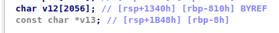 In this debugging case, our encoded data starts at 0x7ffdcc0b8af4, and our saved return address is at 0x7ffdcc0b9308. The offset is 2068. But remember to set v13 (filename) and saved rbp to a valid address, too.